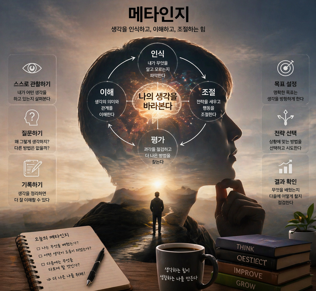 메타인지(Metacognition)란 자신의 생각과 행동을 객관적으로 인식하는 능력을 의미한다. 쉽게 말하면 ‘나를 한 발 떨어져서 보는 능력’이다.